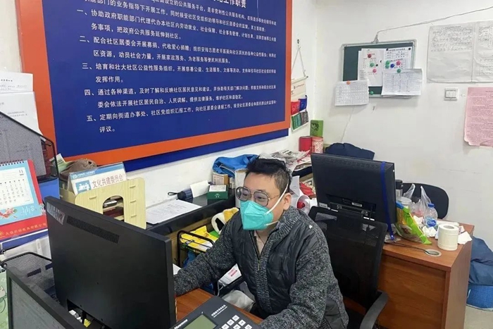 在所服务的丰台区开阳里第三社区,孔维严格执行防控要求,不论天气多么寒冷,他都坚守在社区卡口,同时他还与其他社工人员对小区内出现的阳性病例进行流调,并协助社区人员撰写处置报告。